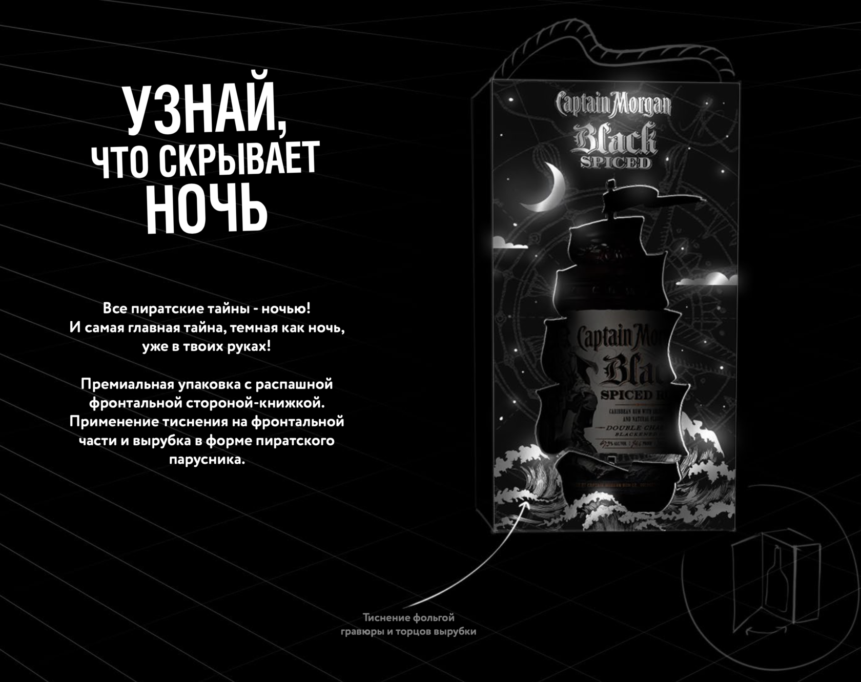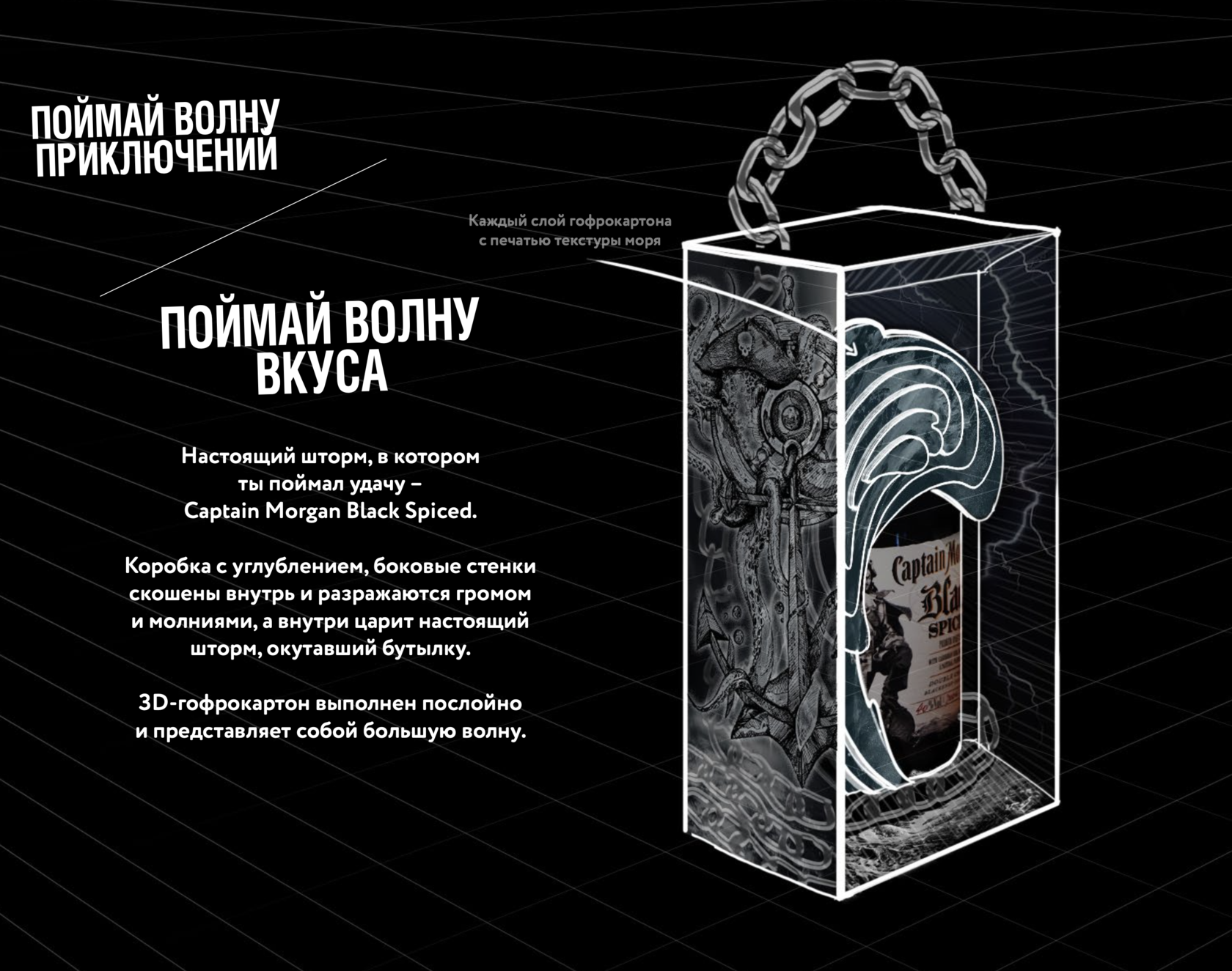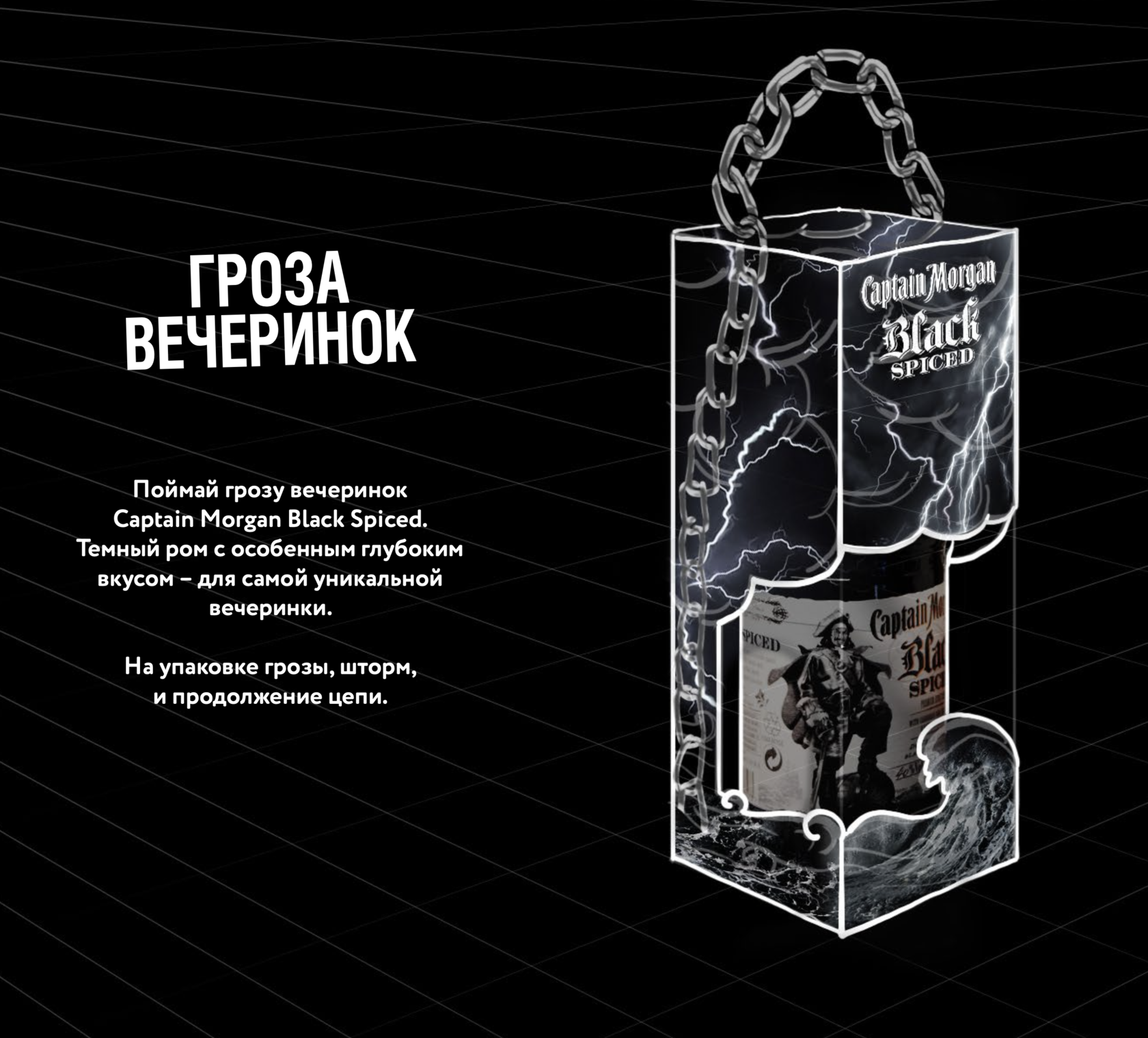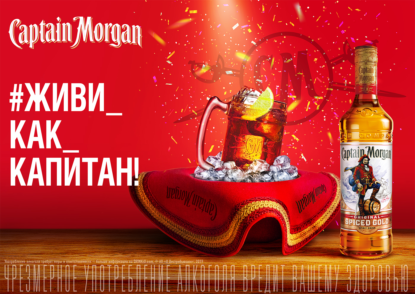 Один из продуктов компании, для которого было разработано множество ключевых визуалов и упаковок, — напиток Captain Morgan. Он обладает уникальной идеологией вечеринок и ориентирован на определенную целевую аудиторию.